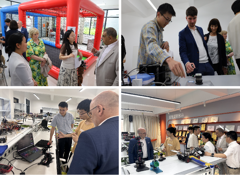 在程培红院长和于华书记的陪同下,代表团先后参观了光电信息工程实验室、新能源与电力实验室、智能装备与控制技术实验室、人工智能应用实验室等。各实验室负责人分别向代表团详细介绍了团队的最新研究成果,双方围绕各自关心的研究方向展开了深入交流与热烈讨论。代表团还参观了电信学院学生创新实验室。实验室中陈列着学生在各类科技竞赛、创新创业项目中的优秀成果,充分展示了我院学生的实践能力和创新精神。代表团成员对同学们展现出的创新能力和取得的各项荣誉表示高度赞赏,并对学院长期坚持以学生为本、鼓励学生科技创新的教育理念给予充分肯定。
