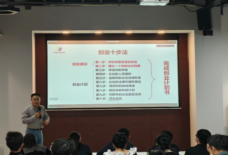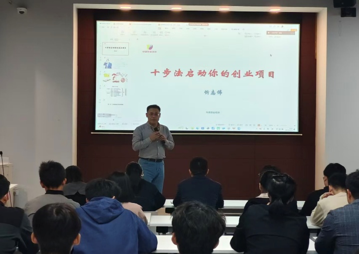 公开课上,忻老师结合自身丰富的实战案例,系统讲解了国际通用的SYB创业十步法。从第一步“自我评估,判断创业适配度”到第十步“工商注册、资质办理等落地流程”,忻老师将复杂的创业过程拆解为十个清晰的步骤,内容覆盖市场评估、团队构建、法律形态选择、启动资金预测、盈利计划制定等创业全流程。讲解深入浅出,案例生动详实,为同学们提供了极具操作性的方法论指导。